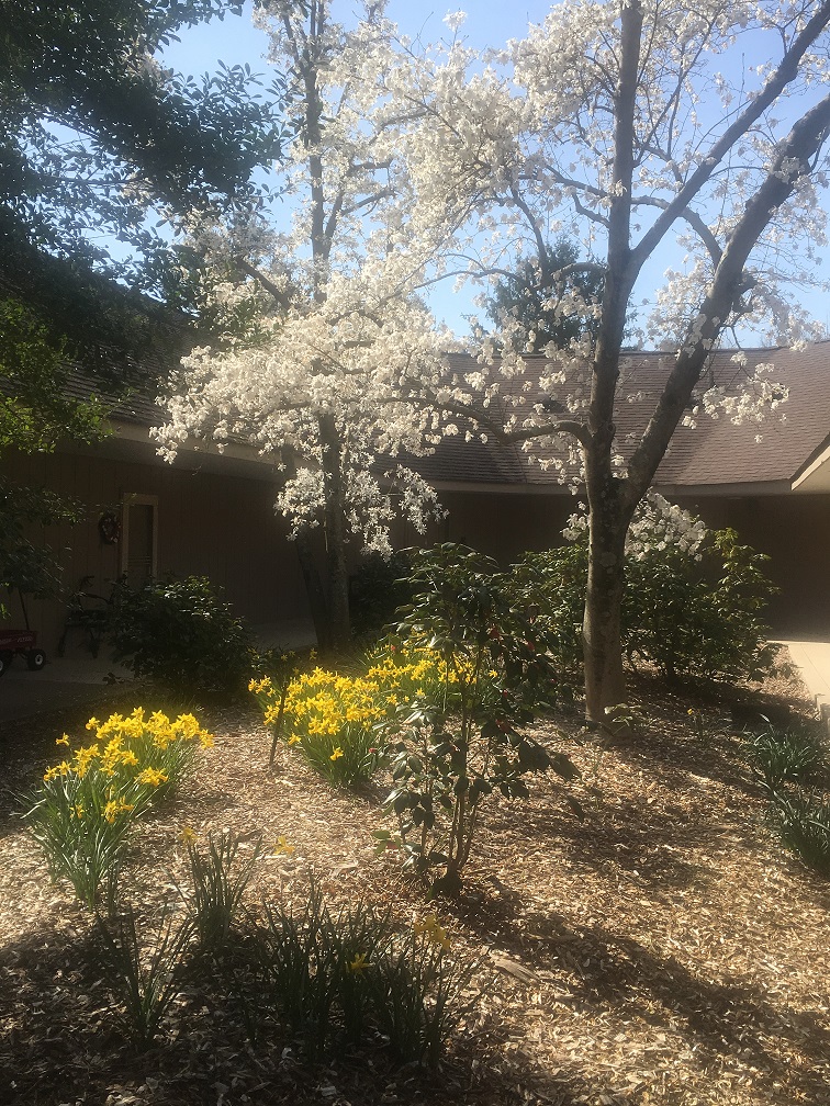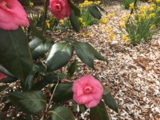 Last fall and continuing into this Spring, a number of improvements have been made in Court 17 on the Medford Campus. Just this week a hardy Korean Camelia japonica was planted. This plant is known for its dependability to offer showy cherry colored blooms. The shrub is a gift from Paul Meyer and our friends at the Morris Arboretum. The Court also features a swath of daffodils in bloom, as well as other woodland plants.