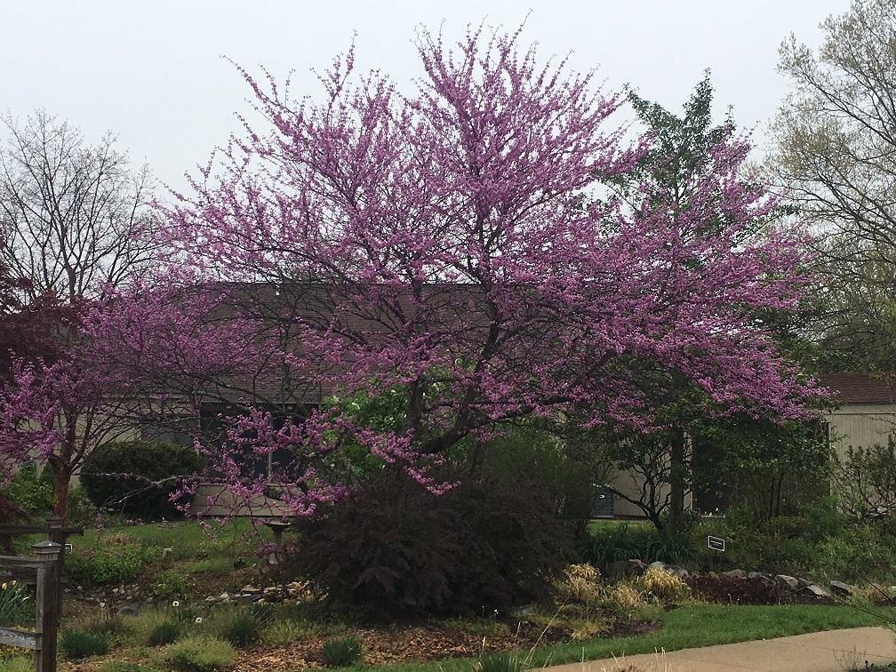 Eastern redbud (Cercis canadensis) is a tree native to the eastern woodlands from New Jersey to south to northern Florida. This lovely harbinger of spring has been called “a breath of fresh air after a long winter” and no less than “one of our most beautiful native trees” by tree expert Michael Dirr. What makes the redbud so special is its gift of spring color. This tree bears showy pink flowers in early spring. The reddish leaves emerge next, giving way to a lustrous summer green and finally to a striking fall yellow. The unique color makes the redbuds easy to find on both campuses and they are often visible in the woodlands as you navigate the local area.