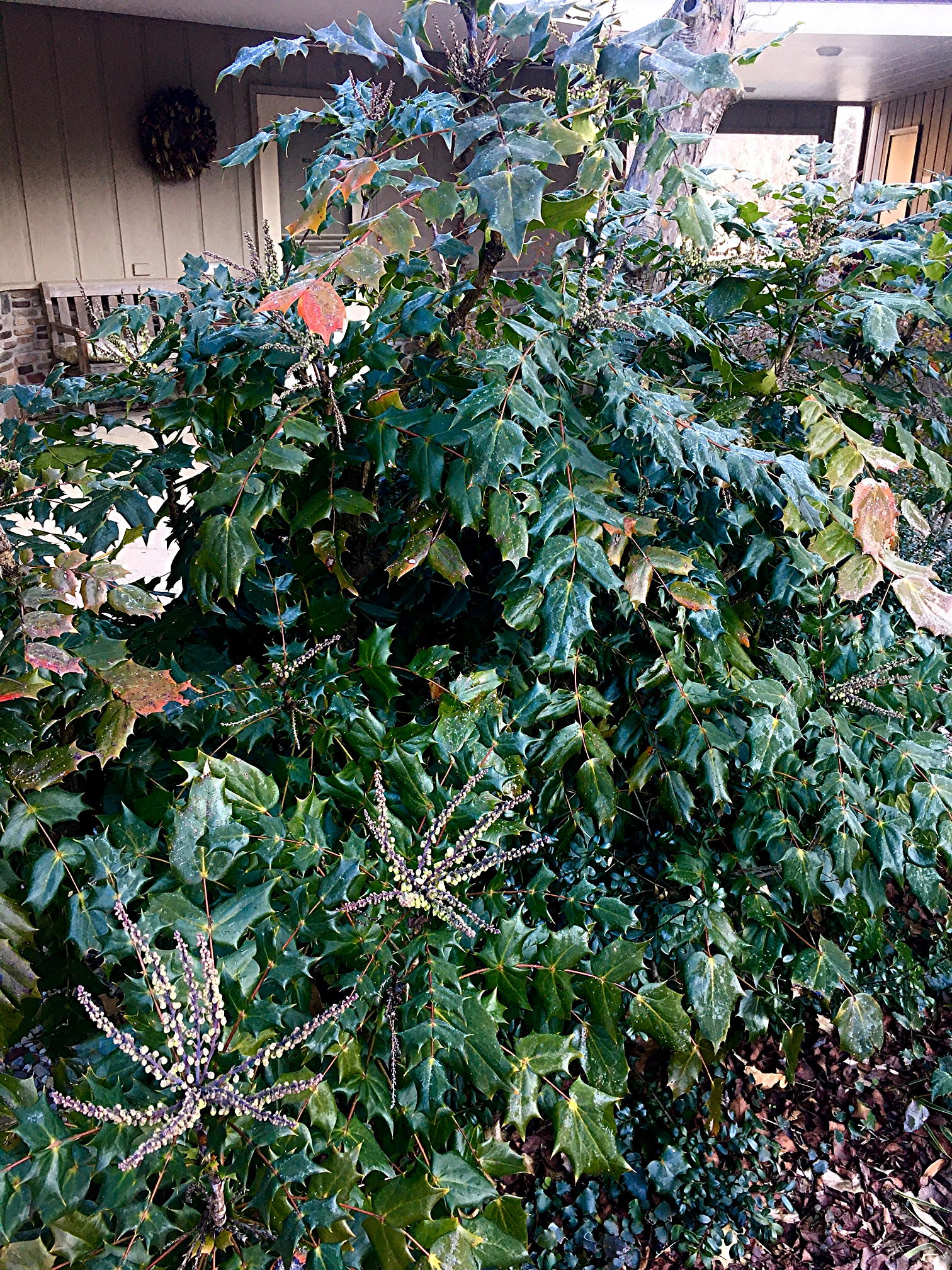 With its ever present green holly-like foliage, fragrant yellow flowers in the spring and inky blue berries in the fall, leatherleaf mahonia, Mahonia bealei, adds year-round interest in Court 4 and Court 2 on the Medford Campus. This shrub grows slowly and requires very little pruning to control its size. Leatherleaf mahonia belongs to a class of shrubs known as broadleaf evergreens.
