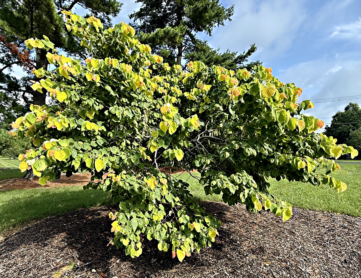 Known and beloved for bright spring blooms, the Redbud tree, Cercis canadensis, is fascinating for another reason: the color gradient in its leaves! New growth is a bright orangey-green that turns much greener as it matures, resulting in a visually striking pattern. This specimen is on the corner of Woolman Way and Rushmore Lane but there are many others to look for when you are Out and About.