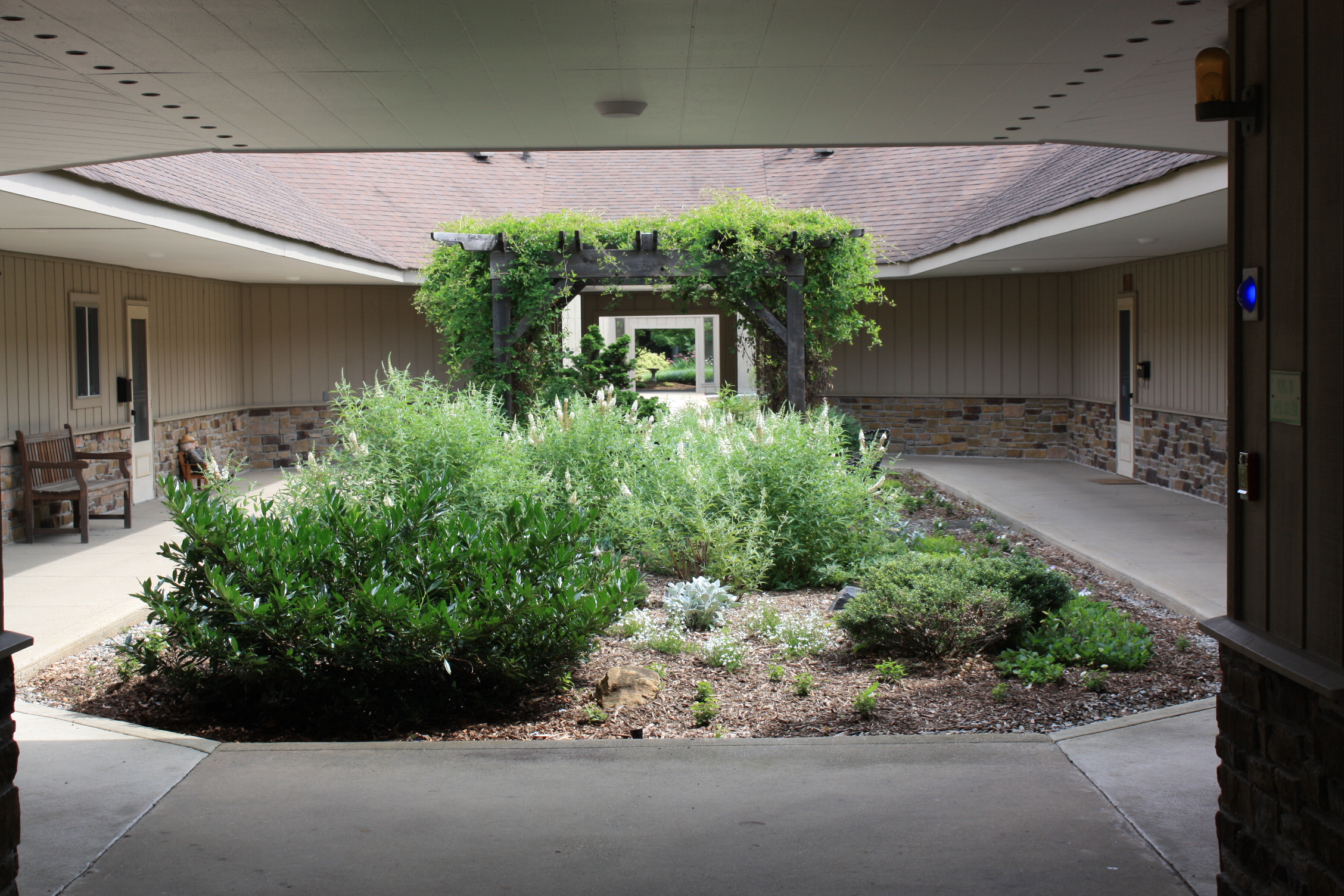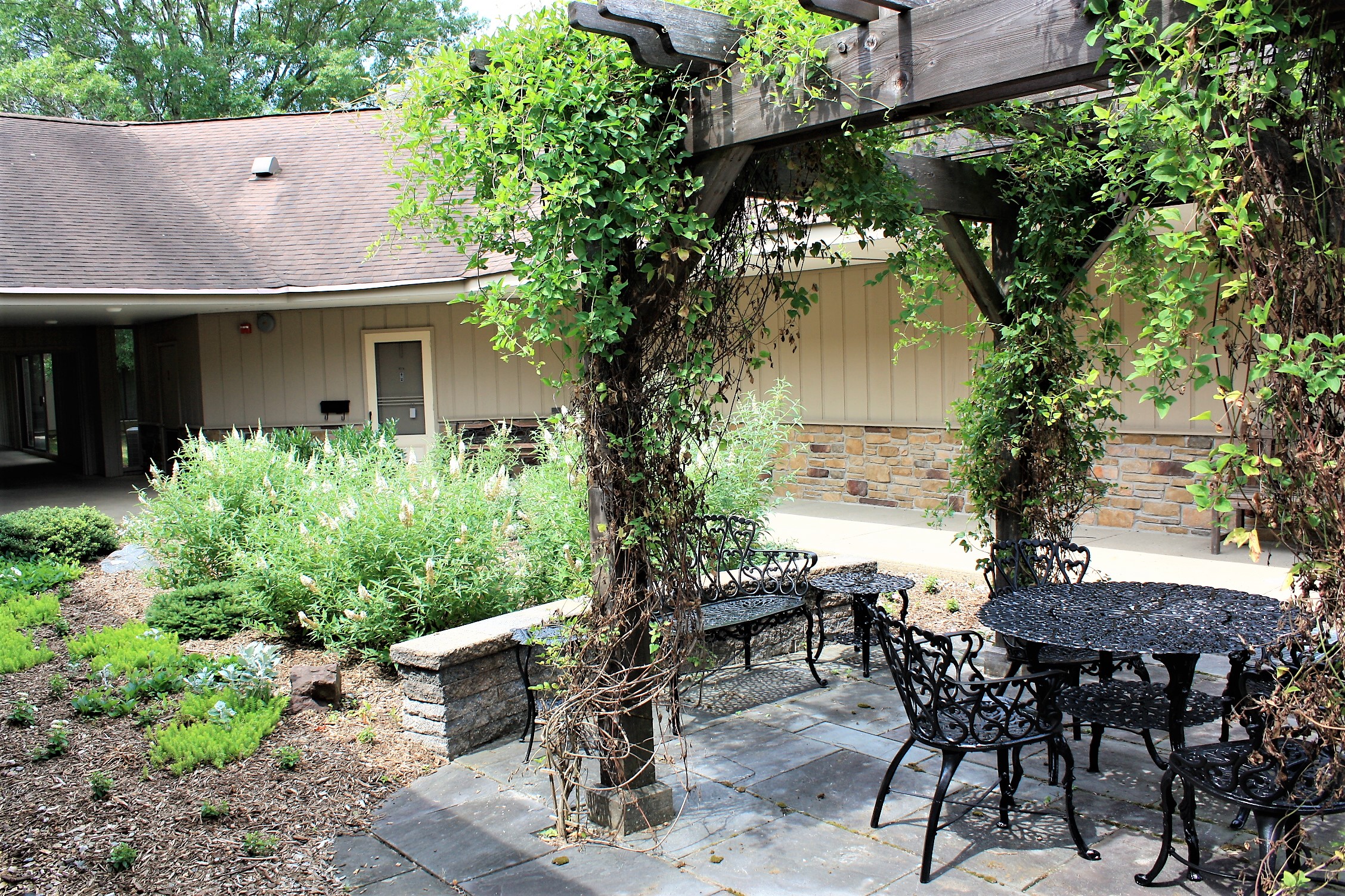 One of the charms of the Courtyard Gardens on the Medford Campus is the variety of garden styles and designs. Right now, Courtyard Garden Ten is a vision of cooling white plant material. The white Buddleia and Petunias are attractive to the butterflies and provide a calm and tranquil setting. Keep an eye out for the Sweet Autumn Clematis which is growing up the pergola. This vine will provide a wonderful fragrance and delicate white flower as we move towards the end of the summer heat.