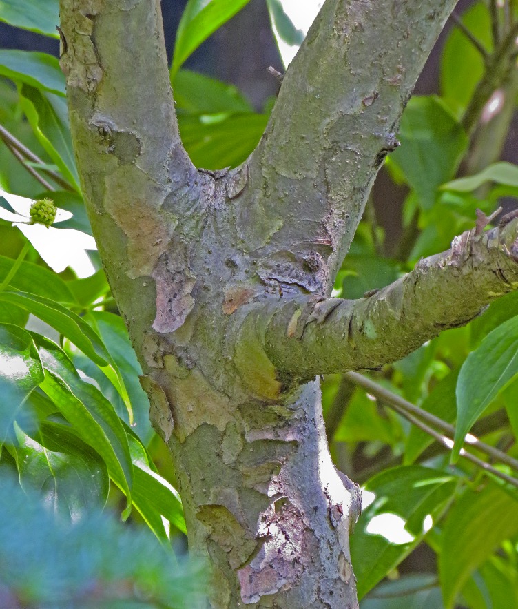 Introduced to North American in 1861, the Kousa Dogwood is an elegant Asian cousin of the familiar native flowering dogwood. This tree has gained popularity due to its disease resistance, long bloom of creamy bracts, colorful red fruit in late summer for the birds to enjoy, and last but not least, its interesting mosaic bark featured throughout the year. There are a number of Kousa Dogwoods on both campuses. The easiest to find and enjoy is located in the Atrium Garden on the Medford Campus.
