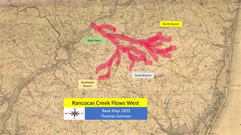 The Rancocas Creek is long and meandering with three branches and many small tributaries arising in the Pinelands National Reserve. The creek’s North Branch (28miles long) begins just south of Fort Dix, flowing into Mirror Lake in northern Burlington County. The South Branch (22 miles long) starts near Chatsworth in the central part of the county. It receives the Southwest Branch (14 miles long) about 7 miles north of Medford. The two main branches merge near Rancocas State Park and flow together for 8 miles to the Delaware River.