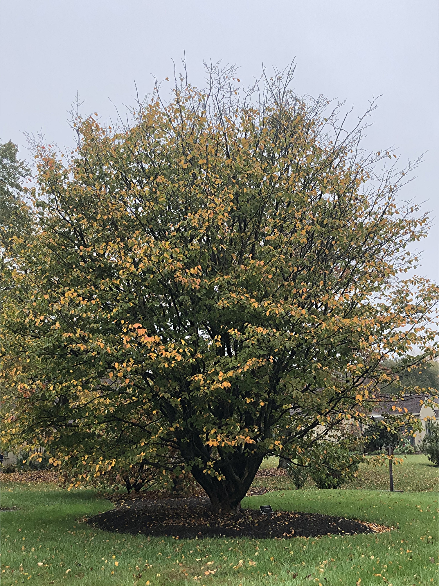 As you are out and about in the Arboretum on the Medford Campus, traversing between Courts Six and Ten, you will see the Persian parrotia or Persian ironwood (Parrotia persica). This beauty of this upright tree is its multi-stemmed presentation, with green leaves that are currently turning various shades of red, orange and yellow. The mature bark exfoliates to patches of green, tan, and white as we get into the winter season.